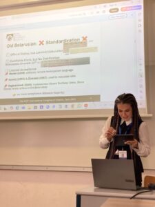 Tatsiana Nazaranka hielt einen Vortrag mit dem Titel Belarusian: Mind the Gap Between Taraškeviča and Narkamaŭka. Im Mittelpunkt stand die Entwicklung der Standardisierung des Belarussischen sowie das Nebeneinander zweier Kodifikationen: Taraškevica, benannt nach Branislaŭ Taraškevič, und Narkamaŭka, die ihren Namen vom Narodny Kamisariat, dem leitenden Organ der Belarussischen Sozialistischen Sowjetrepublik, ableitet. Der Beitrag argumentiert, dass zwei gegensätzliche Richtungen im Standardisierungsprozess des modernen Belarussischen – eine Standardisierung von unten und eine Standardisierung von oben – eine anhaltende Spannung zwischen Narkamaŭka und Taraškevica hervorgebracht haben. Diese Spannung zeigt sich unter anderem in zeitgenössischen digitalen Diskursen, etwa in Instagram-Posts. Das Extended Abstract des Vortrags wird 2026 im Wiener Slawistischer Almanach veröffentlicht.